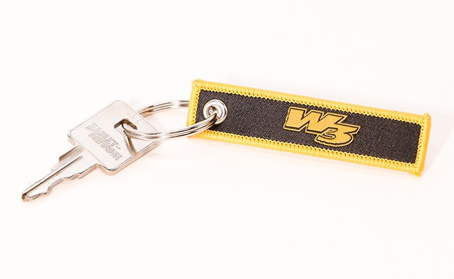 • Feuling W3 flight tag woven patch keychain. Black/Gold