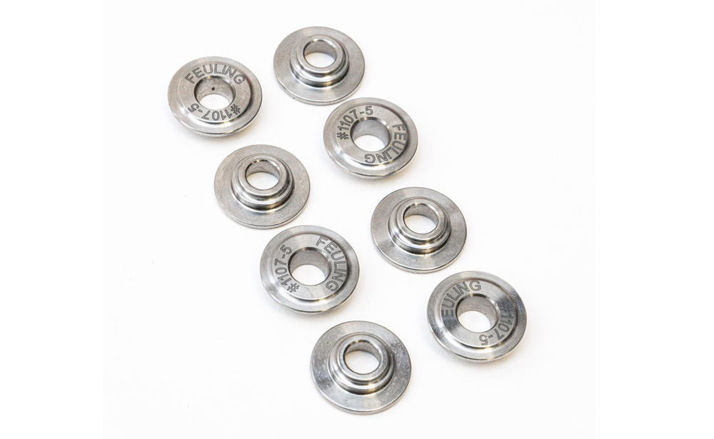 Ti retainers, minus 0.050 fits Feuling Beehive Valvespring spring kit #1107 and or the factory and SE M8 valvesprings (Qty. 8) Minus 0.050, lowers the installed height will allow use of smaller lift camshafts while keeping the valvesping in the proper open height spec. Will also raise valvesping pressures.