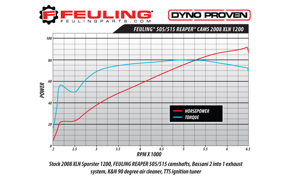 • PART # 1370 505/515 Bolt-in REAPER cams for XLs producing a wide power band in stock engines, a great way to take a Sporty to a hot new level of performance. Split lift camshaft with .505 lift on the intake and .515 lift on the exhaust produce a solid power band with top fuel sound. Can be used with stock pushrods and valve-springs, FEULING recommends matching new camshafts with new lifters but not required.