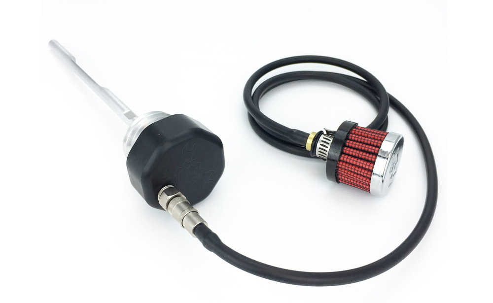 The FEULING billet dipsticks vent/breathe excessive crank case pressure from the oil tank through a PCV style breather, consisting of an oil separator system, perforated disc, replaceable filter element and umbrella flapper valve. Feuling vented dipsticks screw into the factory oil fill spout as a stock replacement part. These breathing dipsticks remove unwanted build-up of blow by pressure in the oil tank.