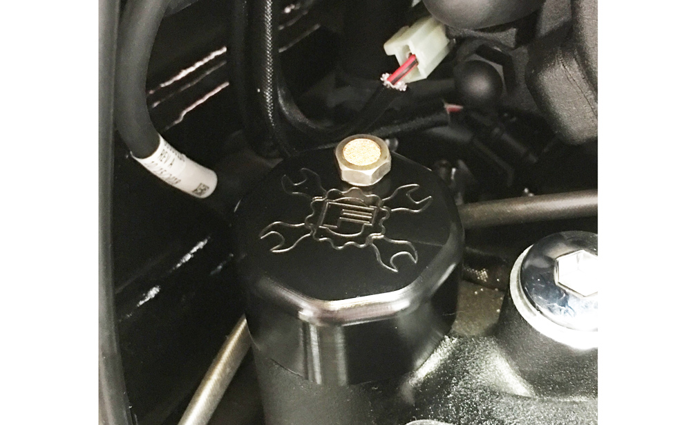 For option 2, we recommend routing the line up the frame rail, up under the seat/abs area then back down along the right side frame rail and the filter element can fit cleanly between the engine/trans matting area on the inside of the lower right frame rail.