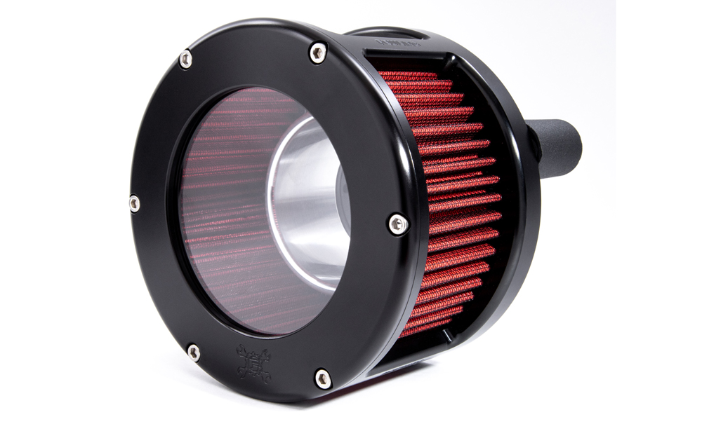 Available in raw, black, or chrome finish, solid or clear cover and red or black filter element.