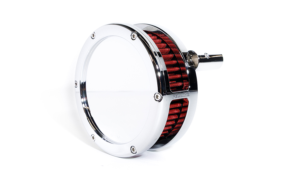 With performance in mind, we created a convertible backing plate offering optional cylinder head venting. Out of the box, the FEULING air cleaner is set up with OEM - style cylinder head breathing, routing into the intake with optimized vent hole locations to meet emissions standards. External Race Only venting to atmosphere available with separate purchase of kit #5417 which includes fittings, vent line and breather element. The backing plate is engraved with both MADE IN USA and FEULING logos.