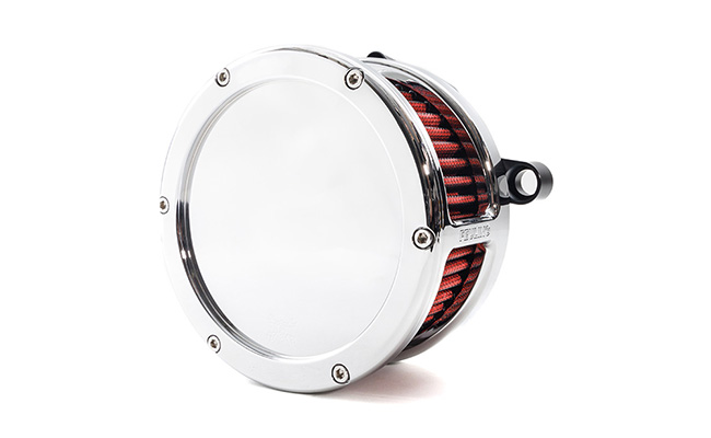 Available in black, or chrome finish, solid or clear cover and red or black filter element.