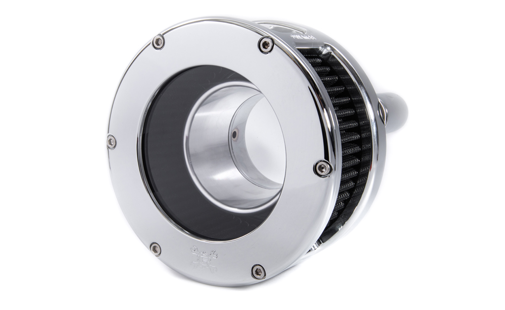 Available in raw, black, or chrome finish, solid or clear cover and red or black filter element.