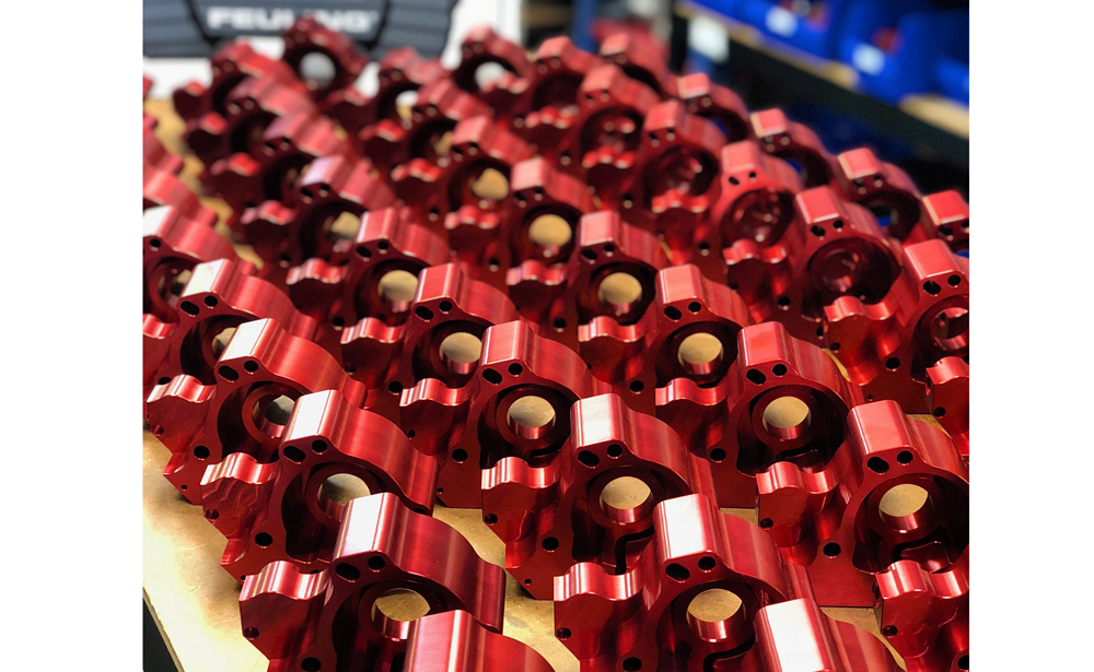 Billet 7075 aluminum with red anodize, this material holds tighter tolerance under temperature, is 50% harder and stronger than 6061 aluminum.