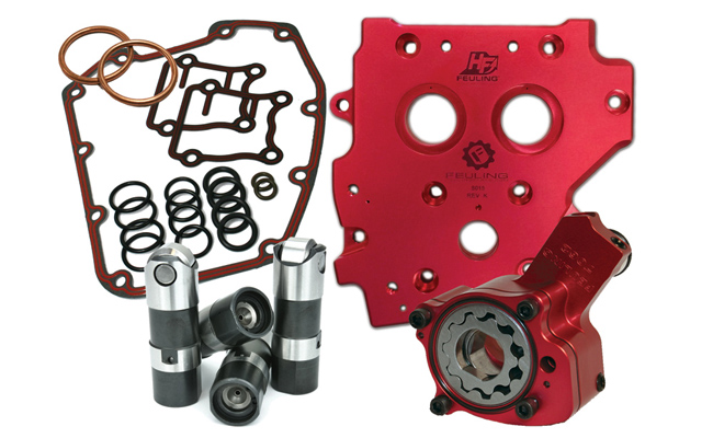 -Both HP+ and RACE SERIES kits include FEULINGS HIGH FLOW billet anodized camplate made from 7075 aluminum which is 50% harder and stronger than the factory, SE and other aftermarket camplates. FEULING increases oil flow and volume by enlarging the oil pump reservoirs and critical oil passages including matching the oil port holes throughout the camplate to the port holes in the engine case which increases engine oil flow to the lifters, piston cooling jets, crankshaft and rod bearings.