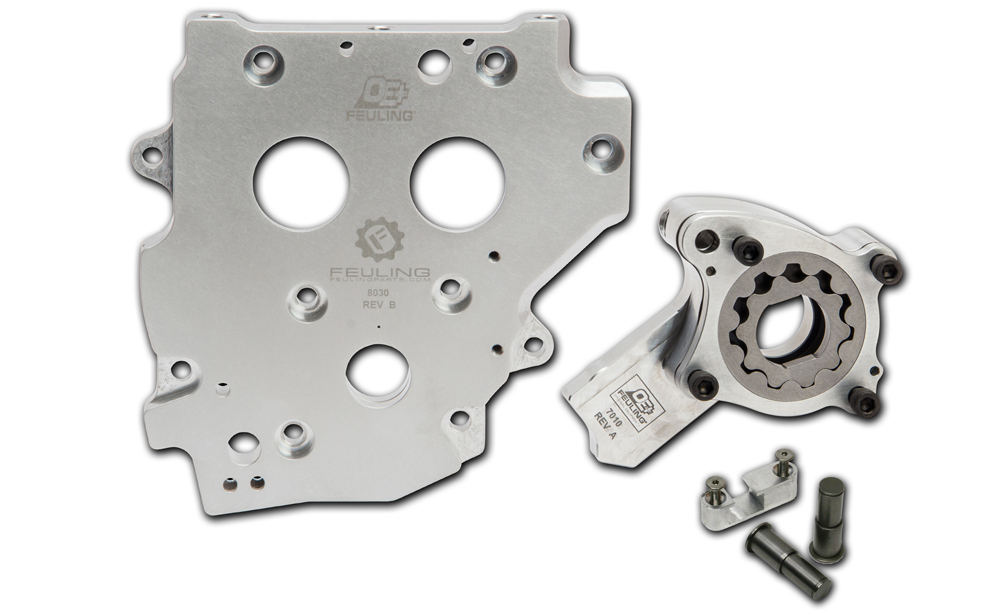 FEULING OE+ oil pump and camplate kits are an upgrade to the stock oiling system, delivering increased oil pressure and return scavenge volumes from an OE+ billet oil pump and matched OE+ billet camplate. The OE+ billet camplates have increased rigidity and are machined to tighter tolerances compared to stock. The OE+ camplate pressure relief valve and spring are seated and pre-set with a 50-60 psi pop off.