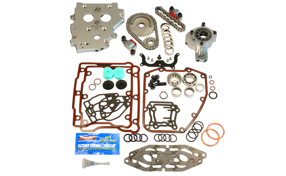 Kit includes the needed components to upgrade early 99-06 style mechanical spring tensioner cam chain drive systems to the late 07-17 hydraulic cam chain drive system using a hybrid camplate. This kit includes a FEULING OE+ billet oil pump and camplate, FEULINGS billet hydraulic tensioner housings, tensioner pads, cam chains, sprockets, sprocket alignment spacers, TIMKEN/FEULING bearings, needed gaskets, O-rings, ARP cam and crank hardware, Loctite and moly lube.