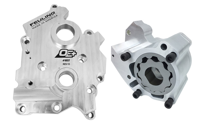 FEULING OE+ stock replacement billet oil pumps deliver increased oil pressure and return scavenge volumes over the factory oil pumps by using larger gerotors and properly sized passages. They will also increase the oil pressure by using a precision machined pressure relief valve which is seated and sealed to a minimum of 30 psi with full pop off at 55-65 psi.