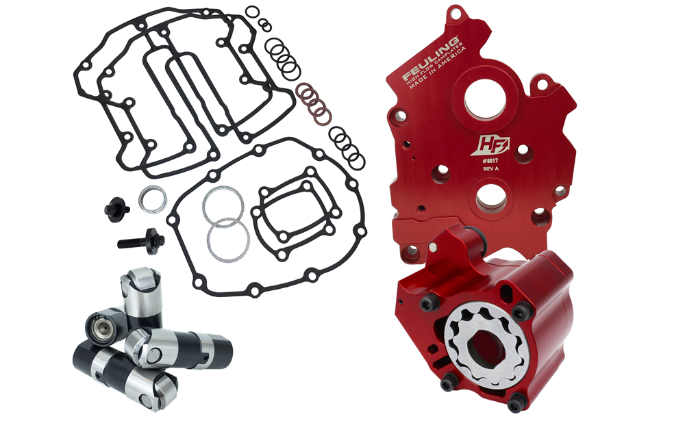 RACE SERIES kits include FEULINGS HIGH FLOW billet camplate made from 7075 aluminum which is 50% harder and stronger than the factory camplates. FEULING increases oil flow and volume by enlarging the oil pump reservoirs and critical oil passages including matching the oil port holes throughout the camplate to the port holes in the engine case which increases engine oil flow to the lifters, piston cooling jets, crankshaft and rod bearings.