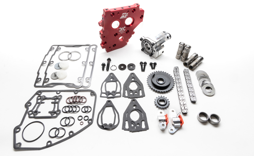 Kit includes the needed components to upgrade early 99-06 style mechanical spring tensioner cam chain drive systems to the late 07-17 hydraulic cam chain drive system using hybrid camshafts. This kit includes a FEULING HP+ billet oil pump, High Flow camplate, HP+ Lifters, FEULINGS billet hydraulic tensioner housings, tensioner pads, cam chains, sprockets, sprocket alignment spacers, TIMKEN/FEULING bearings, needed gaskets, O-rings, ARP cam and crank hardware, Loctite and moly lube. Requires purchase of conversion style camshafts.