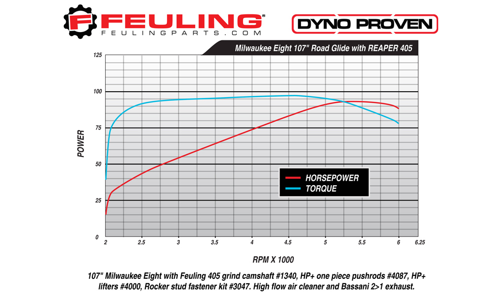 405 CAM - A workhorse, producing a wide powerband increasing torque and HP throughout the entire RPM range when compared to stock. Direct bolt in replacement for Milwaukee Eight engines, can be used with stock valve springs, pushrods, lifters and exhaust. Will respond well with slip-on mufflers and or complete exhaust system and a high flow air cleaner. Note Feuling recommends using free flowing mufflers with smaller cores for best lower RPM power and pull.