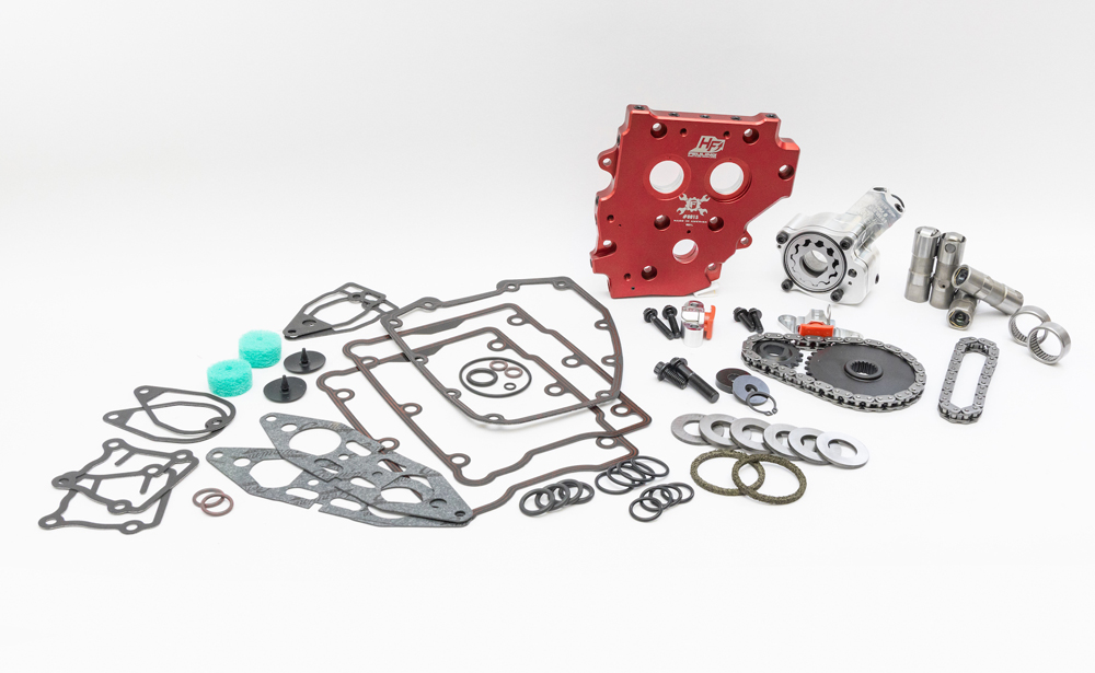 Freshen up your camchest and oiling system on late model Twin Cam engines. This kit uses your existing camshafts or allows purchase of your preferred cam selection while upgrading your camchest with a new HP+ high volume oil pump, High Flow camplate, HP+ lifters, billet tensioner housings, tensioner pads, cam/crank sprockets, sprocket alignment spacers, cam chains, cam bearings, hardware, gaskets, O-rings.
