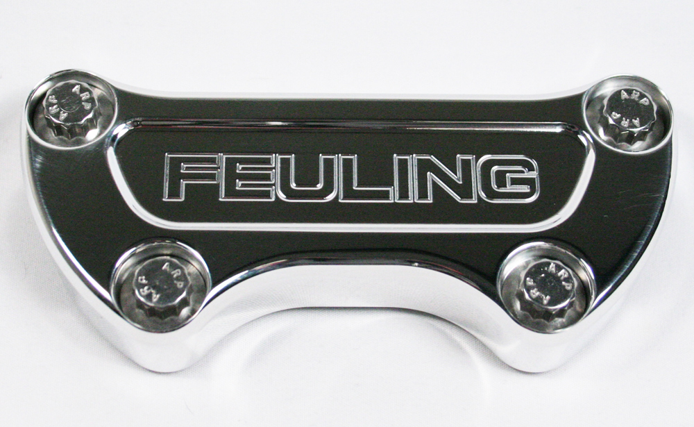• FEULING logo handlebar top clamps, machined from billet 7050 aluminum, fits 1 bars includes 12 point stainless steel ARP fasteners. Fits most 84-17 models with 3 1/2 on center risers and offset mounting holes.