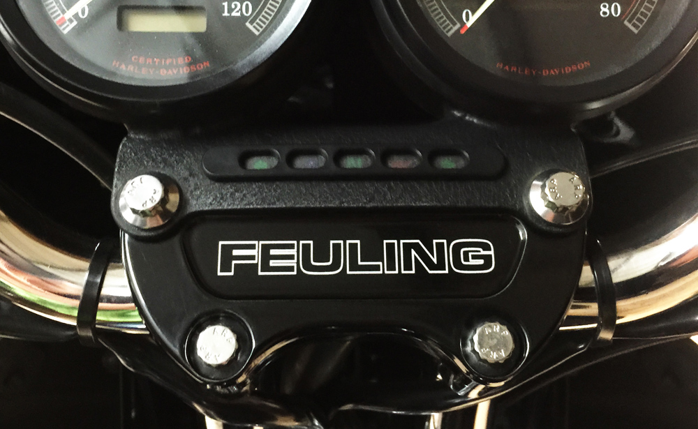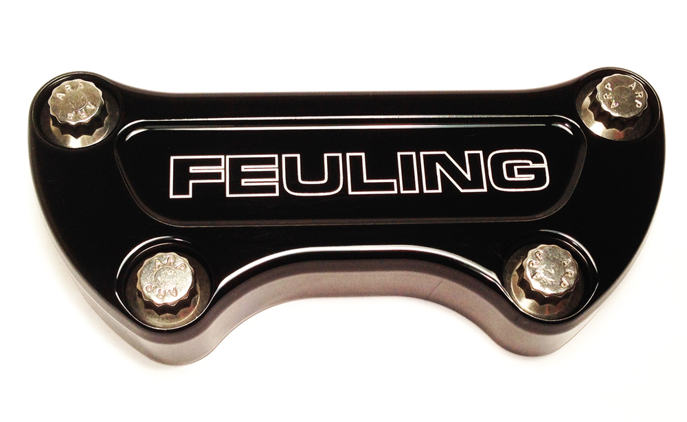 • FEULING logo handlebar top clamps, machined from billet 7050 aluminum, fits 1 bars includes 12 point stainless steel ARP fasteners. Fits most 84-17 models with 3 1/2 on center risers and offset mounting holes.