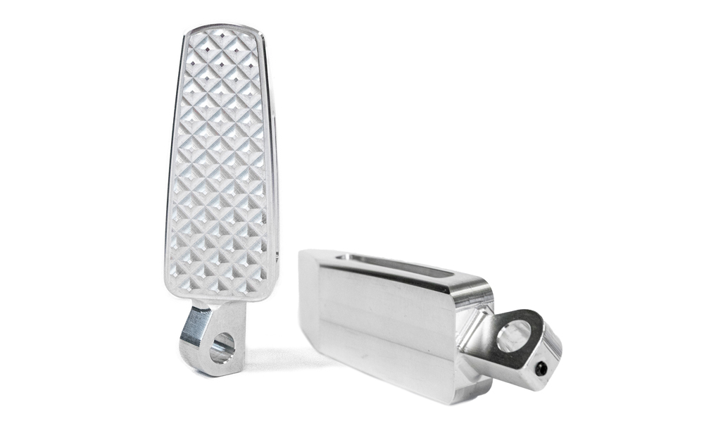 • Billet 7075 aluminum foot pegs with a slim design and great grip, angle cut for increased ground clearance. Natural machined finish. Adjustable set screw allows rider to set the angle of the peg. Size 3.500 x 1.300