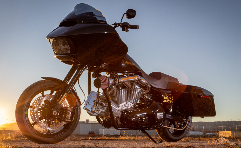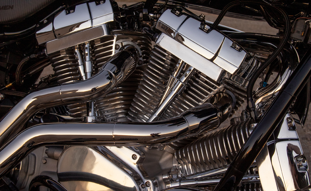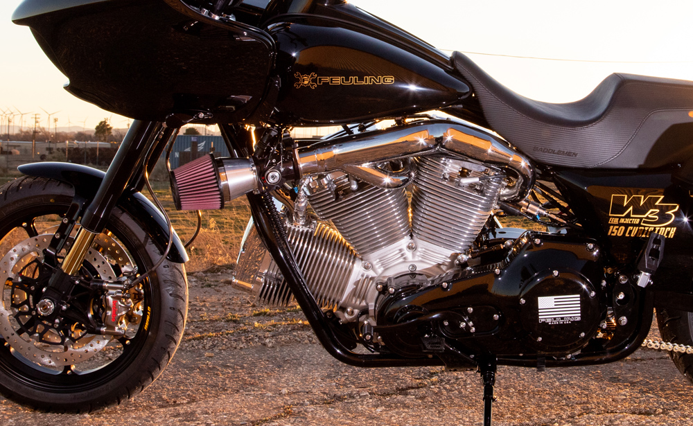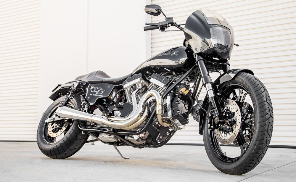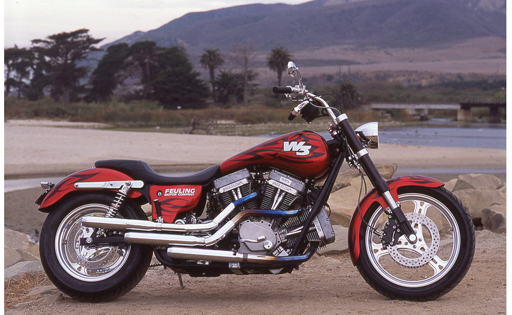 The W3 is a three cylinder W configuration engine. Air cooled, two-valve, triple gear driven cam, with a 4 bore and 4stroke creating a 150 cubic inch monster. The engine is based on the Harley Twin Cam engine with majority of its components interchangeable. The W3 uses its cubic inch to create the power thus keeping the package very reliable. The three-cylinder arrangement provides inherent smoothness firing at 90 degrees, and the low center of gravity is perfect for motorcycles.